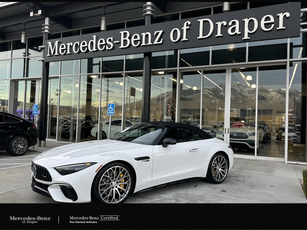 Mercedes-Benz of Draper proudly offers this 2022 Moonlight White Mercedes-Benz SL 63 AMG® 4MATIC. It is well equipped and includes these features and benefits: 4MATIC®, Leather, 11 Speakers, 20 AMG® Twin 5-Spoke Wheels, 4-Wheel Disc Brakes, ABS brakes, Active Multicontour Front Seats w/Massage Feature, Adaptive suspension, Air Conditioning, Alloy wheels, AM/FM radio: SiriusXM, Android Auto®, Apple CarPlay®, Apple CarPlay®/Android Auto®, Auto High-beam Headlights, Auto tilt-away steering wheel, Auto-dimming door mirrors, Auto-dimming Rear-View mirror, Automatic temperature control, Bluetooth® Connectivity, Brake assist, Bumpers: body-color, Burmester® Surround Sound System, Child-Seat-Sensing Airbag, Convertible roof lining, Convertible roof wind blocker, Delay-off headlights, Driver door bin, Driver vanity mirror, Dual front impact airbags, Dual front side impact airbags, Electronic Stability Control, Emergency communication system: Mercedes me connect, Exterior Parking Camera Rear, Four wheel independent suspension, Front anti-roll bar, Front Bucket Seats, Front Center Armrest, Front dual zone A/C, Front reading lights, Garage door transmitter: HomeLink, Glass rear window, Heads-Up Display, Heated front seats, Heated steering wheel, Illuminated entry, Integrated roll-over protection, Knee airbag, Leather steering wheel, Low tire pressure warning, Memory seat, Nappa Leather Upholstery, Navigation System, Occupant sensing airbag, Outside temperature display, Overhead airbag, Overhead console, Panic alarm, Passenger door bin, Passenger vanity mirror, Power convertible roof, Power door mirrors, Power driver seat, Power passenger seat, Power steering, Power windows, Radio data system, Radio: MBUX Infotainment & Navigation System, Rain sensing wipers, Rear anti-roll bar, Rear fog lights, Rear window defroster, Remote keyless entry, Security system, SiriusXM Radio, Smartphone Integration, Speed control, Speed-sensing steering, Spoiler, Sport steering wheel, Steering wheel memory, Steering wheel mounted audio controls, Tachometer, Telescoping steering wheel, Tilt steering wheel, Touring Trim Line, Traction control, Trip computer, Turn signal indicator mirrors, Variably intermittent wipers, and Ventilated front seats.