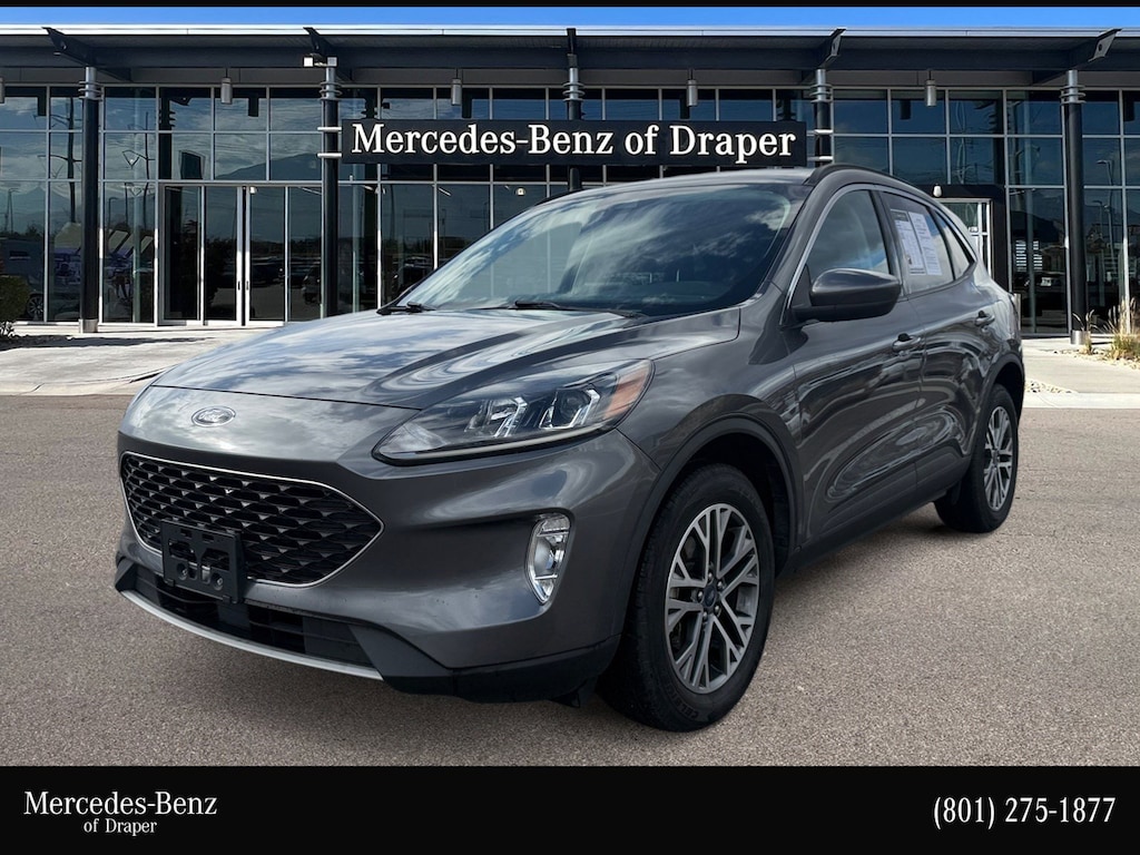 Mercedes-Benz of Draper proudly offers this 2021 Gray Ford Escape SEL AWD . It is well equipped and includes these features and benefits: Equipment Group 301A, Technology Package (Hands-Free Foot-Activated Liftgate, Instrument Panel w/6.5 Digital Screen, Memory Driver's Seat & Side-View Mirrors, Radio: B&O Sound System by Bang & Olufsen, and Wireless Charging Pad), AWD, 18 Machined-Face Aluminum Wheels, 4-Wheel Disc Brakes, 6 Speakers, ABS brakes, Air Conditioning, Alloy wheels, AM/FM radio: SiriusXM, AM/FM Stereo, Auto High-beam Headlights, Automatic temperature control, Brake assist, Bumpers: body-color, Compass, Delay-off headlights, Driver door bin, Driver vanity mirror, Dual front impact airbags, Dual front side impact airbags, Electronic Stability Control, Emergency communication system: SYNC 3 911 Assist, Exterior Parking Camera Rear, FordPass Connect, Four wheel independent suspension, Front anti-roll bar, Front Bucket Seats, Front Center Armrest, Front dual zone A/C, Front fog lights, Front reading lights, Fully automatic headlights, Heated ActiveX Front Sport Contour Bucket Seats, Heated door mirrors, Heated front seats, Heated steering wheel, Illuminated entry, Knee airbag, Low tire pressure warning, Occupant sensing airbag, Outside temperature display, Overhead airbag, Overhead console, Panic alarm, Passenger door bin, Passenger vanity mirror, Power door mirrors, Power driver seat, Power Liftgate, Power steering, Power windows, Radio data system, Rear anti-roll bar, Rear reading lights, Rear seat center armrest, Rear window defroster, Rear window wiper, Remote keyless entry, Roof rack: rails only, Speed control, Speed-sensing steering, Speed-Sensitive Wipers, Split folding rear seat, Spoiler, Steering wheel mounted audio controls, SYNC 3 Communications & Entertainment System, Tachometer, Telescoping steering wheel, Tilt steering wheel, Traction control, Trip computer, and Variably intermittent wipers. Burmester is a registered trademark of Burmester Audiosysteme GmbH, Berlin, Germany. Bluetooth is a registered Mark of Bluetooth SIG, Inc.
