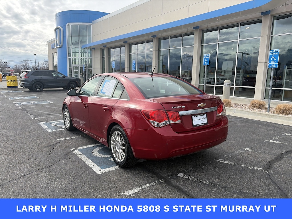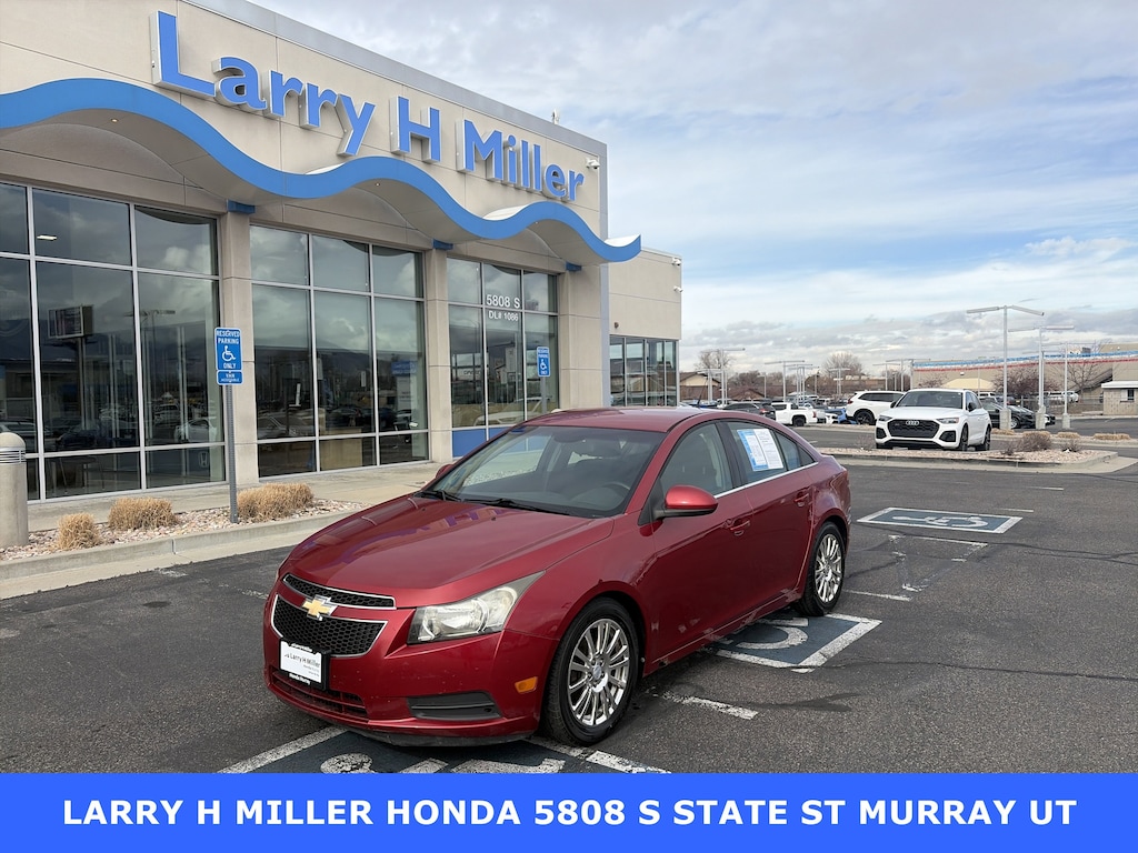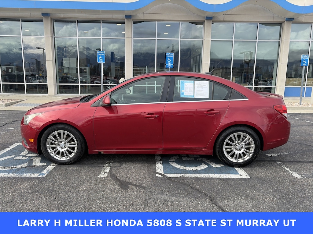 Larry H. Miller Honda Murray offers this 2012 Crystal Red Tintcoat Chevrolet Cruze ECO FWD It is loaded with many standard and optional features including: 1LT Driver Convenience Package (Driver 6-Way Power Seat Adjuster and Rear Park Assist), Enhanced Acoustic Package, Preferred Equipment Group 1XF, 17 Forged Light-Weight Polished Alloy Wheels, 3.53 Final Drive Ratio, 6 Speakers, ABS brakes, Air Conditioning, Alloy wheels, AM/FM radio: SiriusXM, AM/FM Stereo w/CD Player/MP3 Playback, Brake assist, Bumpers: body-color, CD player, Compass, Delay-off headlights, Driver door bin, Driver vanity mirror, Dual front impact airbags, Dual front side impact airbags, Electronic Stability Control, Emergency communication system: OnStar Directions & Connections, Front anti-roll bar, Front Bucket Seats, Front Center Armrest, Front License Plate Bracket, Front reading lights, Front wheel independent suspension, Fully automatic headlights, Illuminated entry, Knee airbag, Low tire pressure warning, Occupant sensing airbag, Outside temperature display, Overhead airbag, Panic alarm, Passenger door bin, Passenger vanity mirror, Power door mirrors, Power steering, Power windows, Premium Cloth Seat Trim, Radio data system, Rear side impact airbag, Rear window defroster, Remote keyless entry, Remote Vehicle Starter System, Security system, SIRIUSXM Satellite Radio, Speed control, Speed-sensing steering, Split folding rear seat, Spoiler, Steering wheel mounted audio controls, Tachometer, Telescoping steering wheel, Tilt steering wheel, Traction control, Trip computer, Variably intermittent wipers, and Voltmeter.