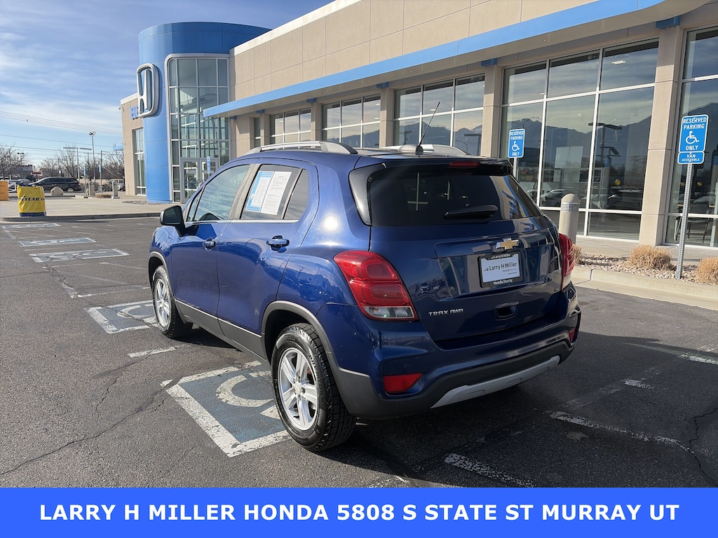 Larry H. Miller Honda Murray offers this 2017 Blue Topaz Metallic Chevrolet Trax LT AWD It is loaded with many standard and optional features including: Preferred Equipment Group 1LT (All-Wheel Drive Chassis), 16 Aluminum Wheels, 2 USB Ports w/Auxiliary Input Jack, 2-Way Manual Front Passenger Seat Adjuster, 3.53 Final Drive Axle Ratio, 4-Way Manual Driver Seat Adjuster, 4-Wheel Disc Brakes, 6 Speakers, 6-Speaker Audio System Feature, ABS brakes, Air Conditioning, Alloy wheels, AM/FM radio: SiriusXM, Apple CarPlay/Android Auto, Brake assist, Bumpers: body-color, Compass, Delay-off headlights, Deluxe Cloth Seat Trim, Driver door bin, Driver vanity mirror, Driver's Seat Mounted Armrest, Dual front impact airbags, Dual front side impact airbags, Electronic Stability Control, Emergency communication system: OnStar Guidance, Exterior Parking Camera Rear, Front anti-roll bar, Front Bucket Seats, Front Bucket Seats w/Driver Power Lumbar, Front License Plate Bracket, Front reading lights, Front wheel independent suspension, Fully automatic headlights, Heated door mirrors, Illuminated entry, Knee airbag, Low tire pressure warning, Occupant sensing airbag, Outside temperature display, Overhead airbag, Panic alarm, Passenger door bin, Passenger vanity mirror, Power door mirrors, Power steering, Power windows, Premium audio system: Chevrolet MyLink, Radio data system, Radio: Chevrolet MyLink Audio System, Rear seat center armrest, Rear side impact airbag, Rear window defroster, Rear window wiper, Remote keyless entry, Roof rack: rails only, Security system, SiriusXM Satellite Radio, Speed control, Speed-sensing steering, Split folding rear seat, Spoiler, Steering wheel mounted audio controls, Tachometer, Telescoping steering wheel, Tilt steering wheel, Traction control, Trip computer, and Variably intermittent wipers.