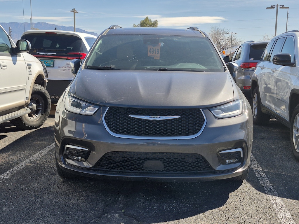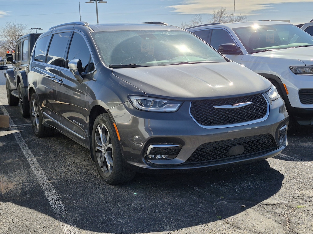This 2021 Granite Crystal Metallic Clearcoat Chrysler Pacifica Pinnacle AWD is well equipped and includes these features and benefits: MOPAR Splash Guards - Vehicle Set (Front Splash Guards and Rear Splash Guards), Quick Order Package 27S, FCA US LLC Certified Pre-Owned Certified, 10.1 Touchscreen Display, 18 Speakers, 220 Amp Alternator, 3.73 Axle Ratio, 3rd row seats: split-bench, 4-Wheel Disc Brakes, A/V remote, ABS brakes, Air Conditioning, Alloy wheels, AM/FM radio: SiriusXM 360L, Apple CarPlay, Apple CarPlay/Android Auto, Audio memory, Auto Adjust In Reverse Exterior Mirrors, Auto-dimming door mirrors, Auto-Dimming Exterior Driver Mirror, Auto-dimming Rear-View mirror, Automatic temperature control, AWD Suspension, Bodyside moldings, Brake assist, Bumpers: body-color, Caramel Seats, Compass, Delay-off headlights, Disassociated Touchscreen Display, Driver door bin, Driver vanity mirror, Dual front impact airbags, Dual front side impact airbags, Electronic Stability Control, Emergency communication system: SiriusXM Guardian, Exterior Mirrors Courtesy Lamps, Exterior Mirrors w/Heating Element, Exterior Mirrors w/Memory, Exterior Mirros w/Supplemental Signals, Four wheel independent suspension, Front anti-roll bar, Front Bucket Seats, Front Center Armrest, Front dual zone A/C, Front fog lights, Front reading lights, Fully automatic headlights, Garage door transmitter: HomeLink, Google Android Auto, GPS Antenna Input, GPS Navigation, harman/kardon® Speakers, HD Radio, Headphones, Heated door mirrors, Heated front seats, Heated rear seats, Heated steering wheel, Illuminated entry, Instrument Panel Satin Silver Bezel, Integrated Center Stack Radio, Integrated Voice Command w/Bluetooth, Knee airbag, Leather steering wheel, Low tire pressure warning, Luxury Interior Accents, Memory seat, Navigation System, Occupant sensing airbag, Outside temperature display, Overhead airbag, Overhead console, Panic alarm, ParkView Rear Back-Up Camera, Passenger door bin, Passenger vanity mirror, Platinum Chrome Exterior Mirrors, Power door mirrors, Power driver seat, Power Liftgate, Power moonroof, Power passenger seat, Power steering, Power windows, Premium Leather Trimmed Bucket Seats, Radio data system, Radio: Uconnect 5 Nav w/10.1 Display, Rain sensing wipers, Rear air conditioning, Rear reading lights, Rear window defroster, Rear window wiper, Reclining 3rd row seat, Remote keyless entry, Roof rack, Security system, SiriusXM Guardian - Included Trial (B), SiriusXM Satellite Radio, SiriusXM w/360L, Speed control, Split folding rear seat, Spoiler, Steering wheel mounted audio controls, Tachometer, Telescoping steering wheel, Tilt steering wheel, Traction control, Trip computer, Turn signal indicator mirrors, USB Host Flip, Variably intermittent wipers, Ventilated front seats, Voltmeter, and Wheels: 20 x 7.5 Paint/Polish Aluminum Design 2. Recent Arrival!