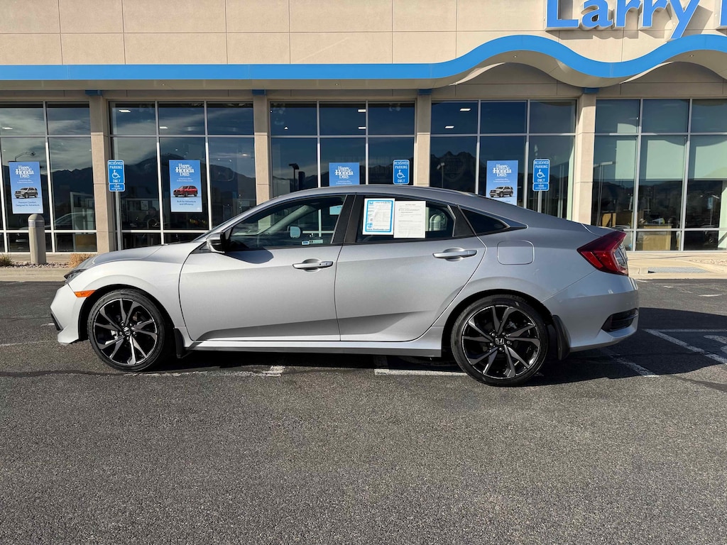 Larry H. Miller Honda Murray offers this 2019 Lunar Silver Metallic Honda Civic Sport FWD It is loaded with many standard and optional features including: Gray Cloth, 4-Wheel Disc Brakes, 8 Speakers, ABS brakes, Air Conditioning, Alloy wheels, AM/FM radio, Apple CarPlay/Android Auto, Auto High-beam Headlights, Automatic temperature control, Brake assist, Bumpers: body-color, Cloth Seat Trim, Delay-off headlights, Driver door bin, Driver vanity mirror, Dual front impact airbags, Dual front side impact airbags, Electronic Stability Control, Emergency communication system: HondaLink, Exterior Parking Camera Rear, Forward collision: Collision Mitigation Braking System (CMBS) + FCW mitigation, Four wheel independent suspension, Front anti-roll bar, Front Bucket Seats, Front Center Armrest, Front fog lights, Front reading lights, Fully automatic headlights, Illuminated entry, Lane departure: Lane Keeping Assist System (LKAS) active, Leather Shift Knob, Low tire pressure warning, Occupant sensing airbag, Outside temperature display, Overhead airbag, Panic alarm, Passenger door bin, Passenger vanity mirror, Power door mirrors, Power steering, Power windows, Radio data system, Radio: 180-Watt AM/FM Audio System, Rear anti-roll bar, Rear window defroster, Remote keyless entry, Security system, Speed control, Speed-sensing steering, Split folding rear seat, Spoiler, Steering wheel mounted audio controls, Tachometer, Telescoping steering wheel, Tilt steering wheel, Traction control, Trip computer, and Wheels: 18 Alloy w/Gloss Black Inserts.