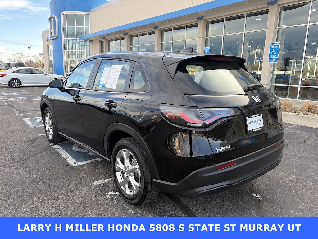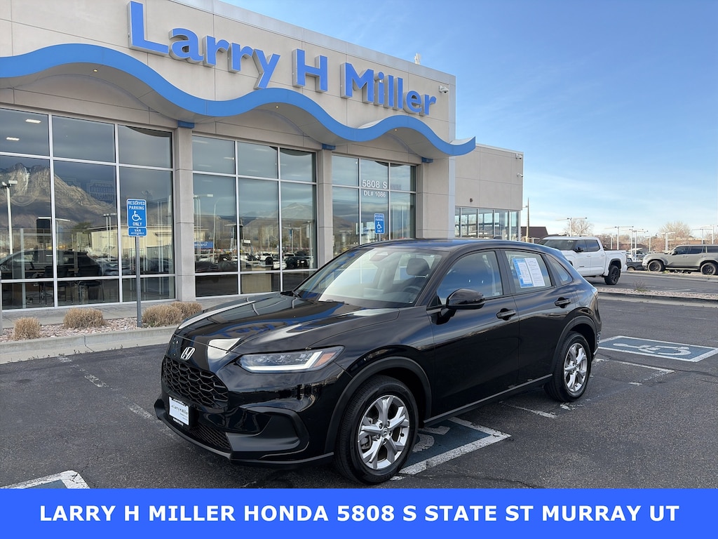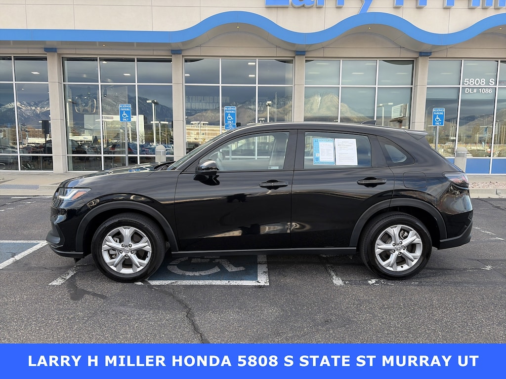 Larry H. Miller Honda Murray offers this 2023 Black Honda HR-V LX AWD It is loaded with many standard and optional features including: 4 Speakers, 4-Wheel Disc Brakes, 5.436 Axle Ratio, ABS brakes, Adaptive Cruise Control: Adaptive Cruise Control (ACC) with Low-Speed Follow, Air Conditioning, Alloy wheels, AM/FM radio, Apple CarPlay/Android Auto, Auto High-beam Headlights, Automatic temperature control, Brake assist, Bumpers: body-color, Cloth Seat Trim, Delay-off headlights, Driver door bin, Driver vanity mirror, Dual front impact airbags, Dual front side impact airbags, Electronic Stability Control, Emergency communication system: HondaLink, Exterior Parking Camera Rear, Four wheel independent suspension, Front anti-roll bar, Front Bucket Seats, Front Center Armrest, Front reading lights, Fully automatic headlights, Illuminated entry, Knee airbag, Low tire pressure warning, Occupant sensing airbag, Outside temperature display, Overhead airbag, Panic alarm, Passenger door bin, Passenger vanity mirror, Power door mirrors, Power steering, Power windows, Radio data system, Radio: 180-Watt Audio System w/4 Speakers, Rear anti-roll bar, Rear reading lights, Rear side impact airbag, Rear window defroster, Rear window wiper, Remote keyless entry, Security system, Speed control, Speed-sensing steering, Split folding rear seat, Spoiler, Steering wheel mounted audio controls, Tachometer, Telescoping steering wheel, Tilt steering wheel, Traction control, Trip computer, Variably intermittent wipers, and Wheels: 17 Silver Painted Alloy.
