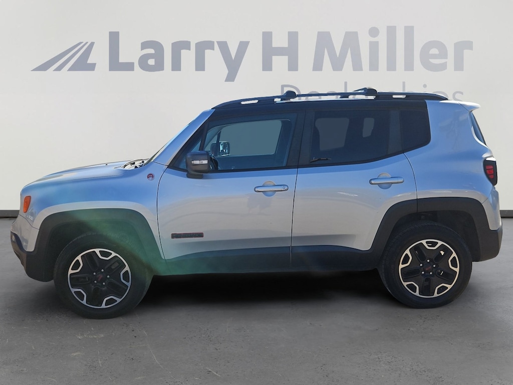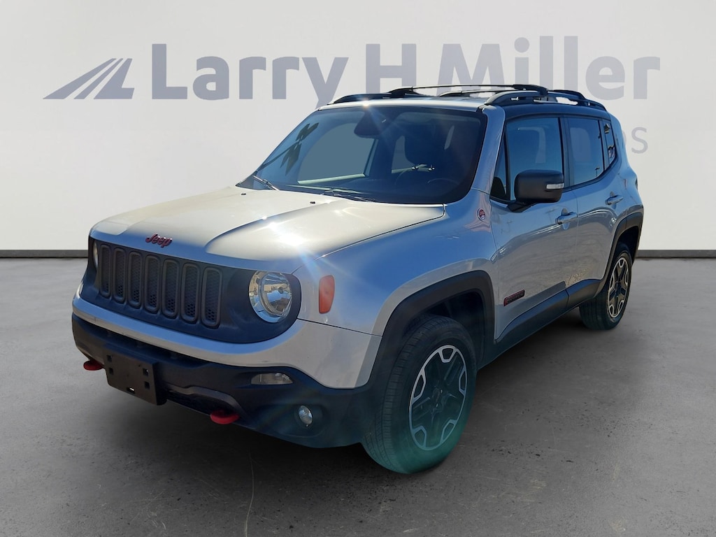 This 2015 Glacier Metallic Jeep Renegade Trailhawk 4WD is well equipped and includes these features and benefits: Quick Order Package 27E, 17 x 6.5 Aluminum Wheels, 4-Wheel Disc Brakes, 4.334 Axle Ratio, 6 Speakers, ABS brakes, Air Conditioning, Alloy wheels, AM/FM radio: SiriusXM, Anti-whiplash front head restraints, Brake assist, Compass, Delay-off headlights, Driver door bin, Driver vanity mirror, Dual front impact airbags, Dual front side impact airbags, Electronic Stability Control, Engine Oil Cooler, Four wheel independent suspension, Front anti-roll bar, Front Bucket Seats, Front Center Armrest, Front fog lights, Front reading lights, Fully automatic headlights, Heated door mirrors, Illuminated entry, Knee airbag, Leather Shift Knob, Leather steering wheel, Leather Wrapped Shift Knob, Low tire pressure warning, Normal Duty Suspension, Occupant sensing airbag, Outside temperature display, Overhead airbag, Overhead console, Panic alarm, ParkView Rear Back-Up Camera, Passenger door bin, Passenger vanity mirror, Power door mirrors, Power steering, Power windows, Premium Cloth Low-Back Bucket Seats, Radio data system, Radio: Uconnect 5.0 AM/FM/BT, Rear anti-roll bar, Rear reading lights, Rear window defroster, Rear window wiper, Remote keyless entry, Roof rack: rails only, Speed control, Split folding rear seat, Spoiler, Steering wheel mounted audio controls, Tachometer, Telescoping steering wheel, Tilt steering wheel, Traction control, Trip computer, Turn signal indicator mirrors, Variably intermittent wipers, and Voltmeter. 17 x 6.5 Aluminum Wheels, 4-Wheel Disc Brakes, 4.334 Axle Ratio, 6 Speakers, ABS brakes, Air Conditioning, Alloy wheels, AM/FM radio: SiriusXM, Anti-whiplash front head restraints, Brake assist, Compass, Delay-off headlights, Driver door bin, Driver vanity mirror, Dual front impact airbags, Dual front side impact airbags, Electronic Stability Control, Engine Oil Cooler, Four wheel independent suspension, Front anti-roll bar, Front Bucket Seats, Front Center Armrest, Front fog lights, Front reading lights, Fully automatic headlights, Heated door mirrors, Illuminated entry, Knee airbag, Leather Shift Knob, Leather steering wheel, Leather Wrapped Shift Knob, Low tire pressure warning, Normal Duty Suspension, Occupant sensing airbag, Outside temperature display, Overhead airbag, Overhead console, Panic alarm, ParkView Rear Back-Up Camera, Passenger door bin, Passenger vanity mirror, Power door mirrors, Power steering, Power windows, Premium Cloth Low-Back Bucket Seats, Quick Order Package 27E, Radio data system, Radio: Uconnect 5.0 AM/FM/BT, Rear anti-roll bar, Rear reading lights, Rear window defroster, Rear window wiper, Remote keyless entry, Roof rack: rails only, Speed control, Split folding rear seat, Spoiler, Steering wheel mounted audio controls, Tachometer, Telescoping steering wheel, Tilt steering wheel, Traction control, Trip computer, Turn signal indicator mirrors, Variably intermittent wipers, Voltmeter.