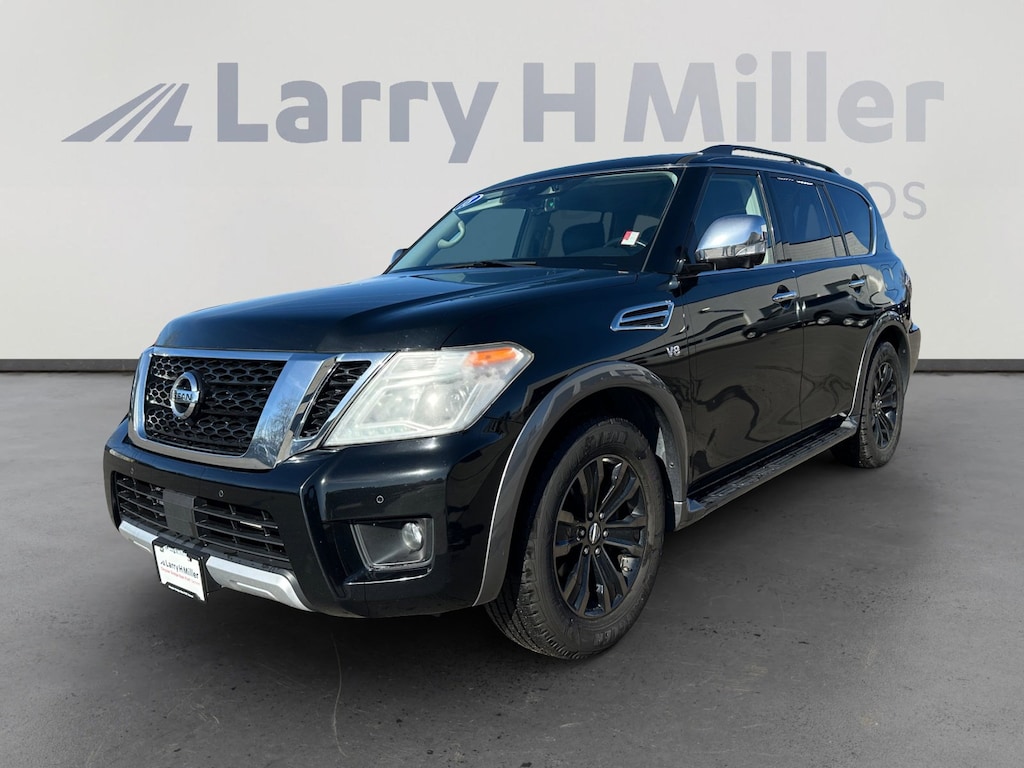 Larry H. MIller Chrysler Dodge Ram Fiat offers this 2018 Super Black Nissan Armada Platinum 4WD. It is well equipped and includes these standard and optional features and benefits: Captain Seat Package (Second Row Captain's Chairs and Second Row Center Console w/ Padded Armrest), Carpeted Floor Mats w/ Captain Seat Package, 4WD, 13 Speakers, 3rd row seats: split-bench, 4-Wheel Disc Brakes, A/V remote, ABS brakes, Air Conditioning, Alloy wheels, Auto tilt-away steering wheel, Auto-dimming door mirrors, Auto-dimming Rear-View mirror, Auto-leveling suspension, Automatic temperature control, Brake assist, Delay-off headlights, Dual front impact airbags, Dual front side impact airbags, Electronic Stability Control, Emergency communication system: NissanConnect Services, Front anti-roll bar, Front dual zone A/C, Front fog lights, Fully automatic headlights, Garage door transmitter: HomeLink, Headphones, Heated & Cooled Front Bucket Seats w/Driver Memory, Heated door mirrors, Heated front seats, Heated rear seats, Heated steering wheel, Illuminated entry, Lane Departure Warning System, Leather Shift Knob, Leather-Appointed Seat Trim, Memory seat, Navigation System, Outside temperature display, Overhead airbag, Panic alarm, Power driver seat, Power Liftgate, Power moonroof, Power passenger seat, Radio: Bose AM/FM/SXM/CD/MP3/HD Radio, Rain sensing wipers, Rear air conditioning, Rear anti-roll bar, Reclining 3rd row seat, Remote keyless entry, Roof rack: rails only, Roof Rail Cross Bars, Security system, Speed control, Split folding rear seat, Spoiler, Steering wheel memory, Steering wheel mounted audio controls, Telescoping steering wheel, Tilt steering wheel, Traction control, Trip computer, Turn signal indicator mirrors, Ventilated front seats, Voltmeter, Wheels: 20 Machine-Faced Chrome w/Tinted CC, 2.937 Axle Ratio, AM/FM radio: SiriusXM, Anti-whiplash front head restraints, Bumpers: body-color, CD player, Driver door bin, Driver vanity mirror, Four wheel independent suspension, Front Bucket Seats, Front Center Armrest, Front reading lights, Low tire pressure warning, Occupant sensing airbag, Overhead console, Passenger door bin, Passenger vanity mirror, Power door mirrors, Power steering, Power windows, Radio data system, Rear reading lights, Rear seat center armrest, Rear window defroster, Rear window wiper, Speed-sensing steering, Speed-Sensitive Wipers, Tachometer, and Variably intermittent wipers.