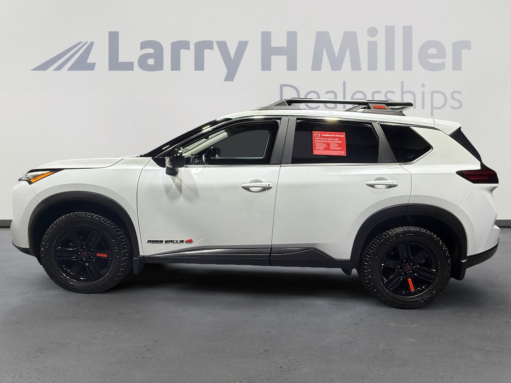 This 2025 Everest White Pearl Nissan Rogue Rock Creek AWD is well equipped and includes these features and benefits: AWD, 4-Wheel Disc Brakes, 6 Speakers, ABS brakes, Air Conditioning, Alloy wheels, AM/FM radio: SiriusXM, Android Auto and Apple CarPlay, Auto High-beam Headlights, Automatic temperature control, Black Splash Guards (set of 4), Brake assist, Delay-off headlights, Driver door bin, Driver vanity mirror, Dual front impact airbags, Dual front side impact airbags, Electronic Stability Control, Emergency communication system: NissanConnect Services, Four wheel independent suspension, Front anti-roll bar, Front Bucket Seats, Front Center Armrest, Front dual zone A/C, Front reading lights, Fully automatic headlights, Heated door mirrors, Heated Front Bucket Seats with 8-Way Power Driver Seat, Heated front seats, Illuminated entry, Knee airbag, Leatherette and Ballistic Nylon Seating with Contrast Stich and Rock Creek Logo, Low tire pressure warning, Occupant sensing airbag, Outside temperature display, Overhead airbag, Overhead console, Panic alarm, Passenger door bin, Passenger vanity mirror, Power door mirrors, Power driver seat, Power Liftgate, Power steering, Power windows, Premium Paint, Radio data system, Radio: NissanConnect with 6 Speakers, Rear anti-roll bar, Rear seat center armrest, Rear side impact airbag, Rear window defroster, Rear window wiper, Remote keyless entry, Rock Creek All-Season 1-Piece Cargo Area Protector with Floor Liners, Roof rack, Speed control, Speed-sensing steering, Speed-Sensitive Wipers, Split folding rear seat, Spoiler, Steering wheel mounted audio controls, Tachometer, Telescoping steering wheel, Tilt steering wheel, Traction control, Trip computer, Variably intermittent wipers, and Wheels: 17 Dark Painted Alloy. 27/32 City/Highway MPG
