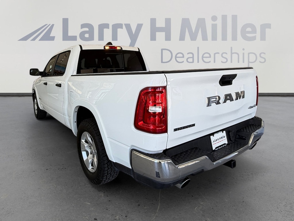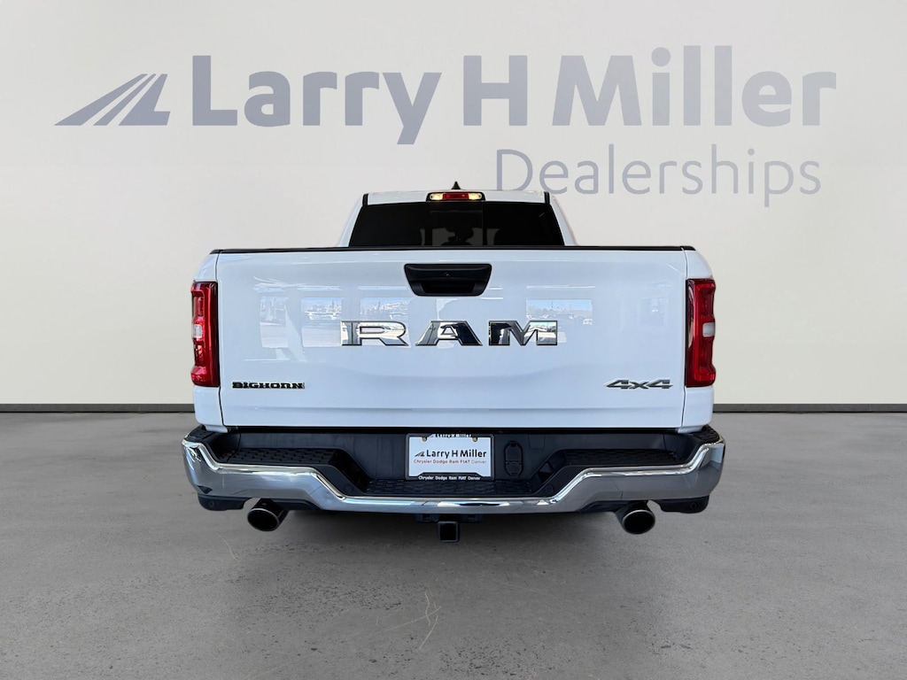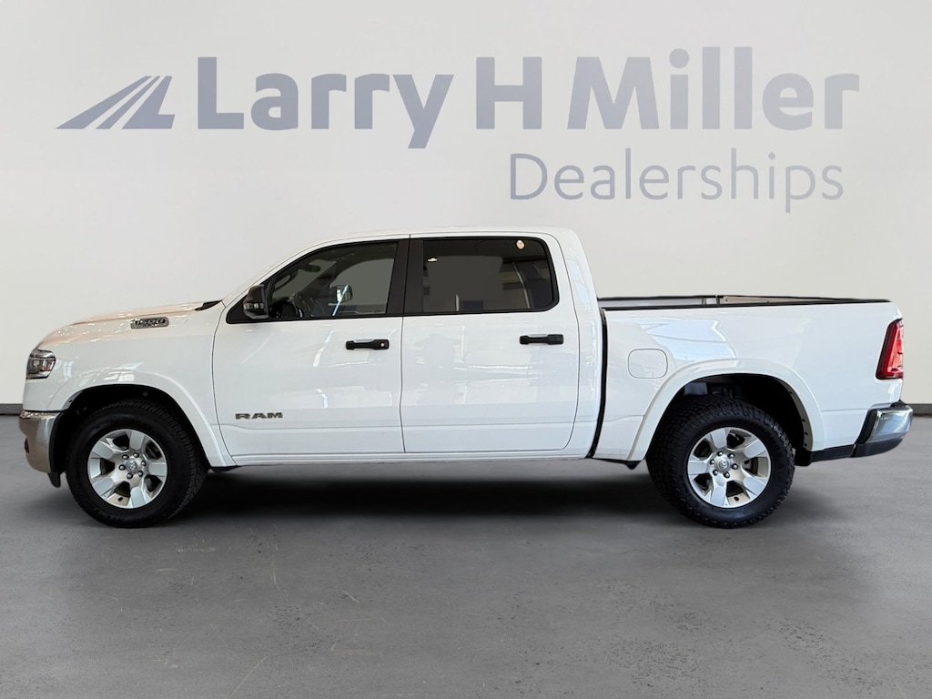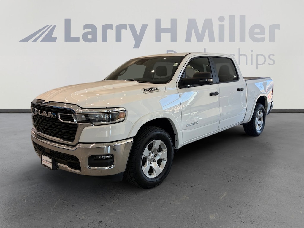 Larry H. MIller Chrysler Dodge Ram Fiat offers this 2025 Bright White Clearcoat Ram 1500 Big Horn/Lone Star 4WD. It is well equipped and includes these standard and optional features and benefits: Big Horn Level 2 Equipment Group (115V Auxiliary Power Outlet, 115V Auxiliary Rear Power Outlet, 12 Touchscreen Display, 2nd Row In Floor Storage Bins, 400W Inverter, 4G LTE Wi-Fi Hot Spot, 9 Amplified Speakers w/Subwoofer, Air Conditioning ATC w/Dual Zone Control, Apple CarPlay, Auto Power-Folding Mirrors, Auto-Dimming Exterior Driver Mirror, Auto-Dimming Rear-View Mirror, Black Exterior Mirrors, Black Premium Power Mirrors, Cluster 7.0 TFT Color Display, Configurable Drive Mode, Connected Travel & Traffic Services, Connectivity - US/Canada, Convex Wide-Angle Exterior Mirror Insert, Exterior Mirrors Courtesy Lamps, Exterior Mirrors w/Heating Element, Exterior Mirrors w/Supplemental Signals, Glove Box Lamp, Google Android Auto, GPS Antenna Input, GPS Navigation, HD Radio, Heated Front Seats, Heated Steering Wheel, Integrated Voice Command w/Bluetooth, Leather Wrapped Steering Wheel, LED Dome Lamp w/On/Off Switch, LED Footwell Lighting, Media Hub w/2 Charge Only USBs, Overhead LED Lamps, Power 2-Way Driver Lumbar Adjust, Power Adjust 8-Way Driver Seat, Power Adjustable Pedals, Premium Overhead Console, Radio: Uconnect 5 Nav w/12.0 Display, Rear Power Sliding Window, Rear Window Defroster, Remote Tailgate Release, Security Alarm, SiriusXM w/360L, Steering Wheel Mounted Audio Controls, Sun Visors w/Illuminated Vanity Mirrors, Universal Garage Door Opener, and USB Host Flip), Quick Order Package 21Z Big Horn, 3 Rear Seat Head Restraints, 4 Way Front Headrests, 4-Wheel Disc Brakes, 6 Speakers, ABS brakes, Air Conditioning, Alloy wheels, AM/FM radio, Apple CarPlay/Android Auto, Auto High-beam Headlights, Brake assist, Bumpers: chrome, Cloth Bench Seat, Compass, Delay-off headlights, Driver door bin, Dual front impact airbags, Dual front side impact airbags, Electronic Stability Control, Front anti-roll bar, Front Center Armrest w/Storage, Front fog lights, Front License Plate Bracket, Front reading lights, Front Seat Back Map Pockets, Front wheel independent suspension, Fully automatic headlights, Heated door mirrors, Illuminated entry, Low tire pressure warning, Manual Adjust 4-Way Front Passenger Seat, Manual Folding Exterior Mirrors, Manufacturer's Statement of Origin, Occupant sensing airbag, Outside temperature display, Overhead airbag, Overhead console, Panic alarm, ParkView Rear Back-Up Camera, Passenger door bin, Passenger vanity mirror, Power door mirrors, Power steering, Power windows, Radio data system, Radio: Uconnect 5 W w/8.4 Display, RAM Grille Badge - Chrome, Rear 60/40 Folding Seat, Rear anti-roll bar, Rear seat center armrest, Rear step bumper, Remote keyless entry, Speed control, Split folding rear seat, Supplier Part Tracking (J-1), Tachometer, Telescoping steering wheel, Tilt steering wheel, Traction control, Trip computer, Variably intermittent wipers, Voltmeter, and Wheels: 18 x 8 Cast-Aluminum Painted.